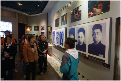 緩步走進(jìn)莊嚴(yán)肅穆的瞻仰廣場(chǎng),映入眼簾的是以“郭建光”、“阿慶嫂”等人物形象創(chuàng)作的巨型主雕屹立在廣場(chǎng)中央;廣場(chǎng)兩側(cè)象征新四軍18個(gè)傷病員的18根柱雕,以形態(tài)各異的塊面造型和強(qiáng)烈的肌理效果對(duì)比,淋漓盡致的表現(xiàn)出新四軍傷病員泰山壓頂不彎腰的革命精神;還有兩組鍛銅浮雕以細(xì)膩、生動(dòng)的構(gòu)圖和豐滿的人物形象,演繹深化了軍民雨水深情的主題。作為革命教育基地,隨處可見(jiàn)的黨旗、國(guó)旗迎風(fēng)招展,激起大家的愛(ài)黨、愛(ài)國(guó)之情,大家自覺(jué)放慢腳步,細(xì)細(xì)品味這片革命先烈曾經(jīng)灑下熱血的“紅土地”。在這塊“紅土地”上,大家邊走邊認(rèn)真聆聽(tīng)了江南抗日義勇軍歷史發(fā)展過(guò)程,細(xì)細(xì)體味著戰(zhàn)爭(zhēng)年代革命先烈艱苦卓絕的革命生活和血濃于水的軍民之情。