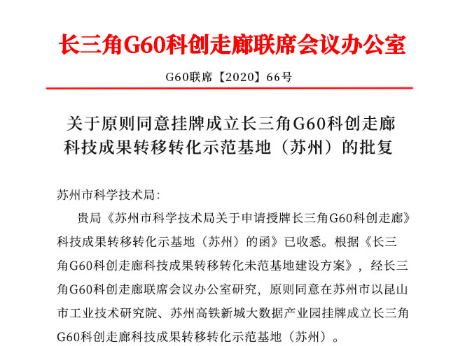 日前,長三角G60科創(chuàng)走廊聯(lián)席會(huì)議辦公室批復(fù)同意我市以昆山市工業(yè)技術(shù)研究院為依托,成立“長三角 G60 科創(chuàng)走廊科技成果轉(zhuǎn)移轉(zhuǎn)化示范基地(蘇州)”。