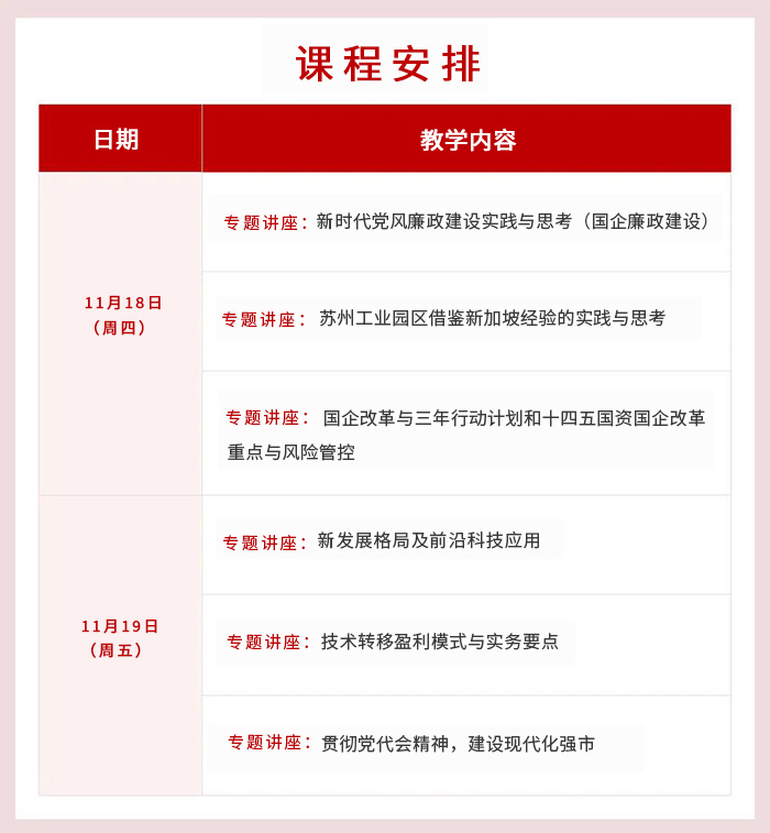 本次培訓班課程充分結合工研院主責主業(yè)作了精心安排,涵蓋傳達貫徹黨代會精神、新時代黨風廉政建設、國企改革三年行動計劃解讀、十四五國資國企改革重點與風險管控、蘇州工業(yè)園區(qū)借鑒新加坡經驗的實踐與思考、新發(fā)展格局及前沿科技應用、技術轉移盈利模式與實務要點等內容,授課老師也均是各領域的專家,課程極具針對性、指導性和實用性。