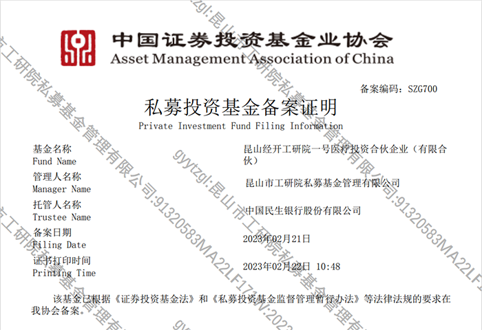 近日,昆山經(jīng)開工研院一號醫(yī)療投資合伙企業(yè)(有限合伙)順利完成中國證券投資基金業(yè)協(xié)會私募投資基金備案。