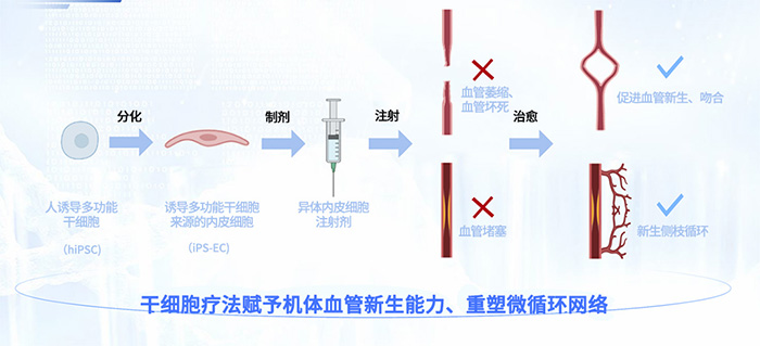 針對心血管疾病中因血管堵塞、血管萎縮、血管壞死等原因導致的缺血性疾病缺乏理想治理手段的現(xiàn)狀,采用干細胞療法賦予機體血管新生能力、重塑微循環(huán)網(wǎng)絡。