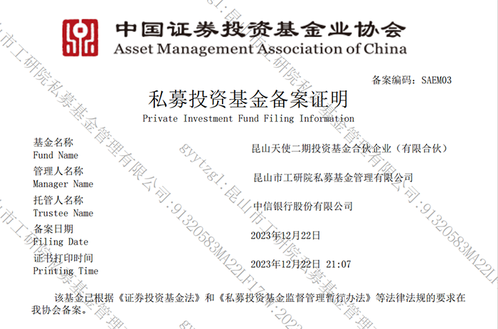 近日,昆山天使二期投資基金合伙企業(yè)(有限合伙)順利完成中國(guó)證券投資基金業(yè)協(xié)會(huì)私募投資基金備案。