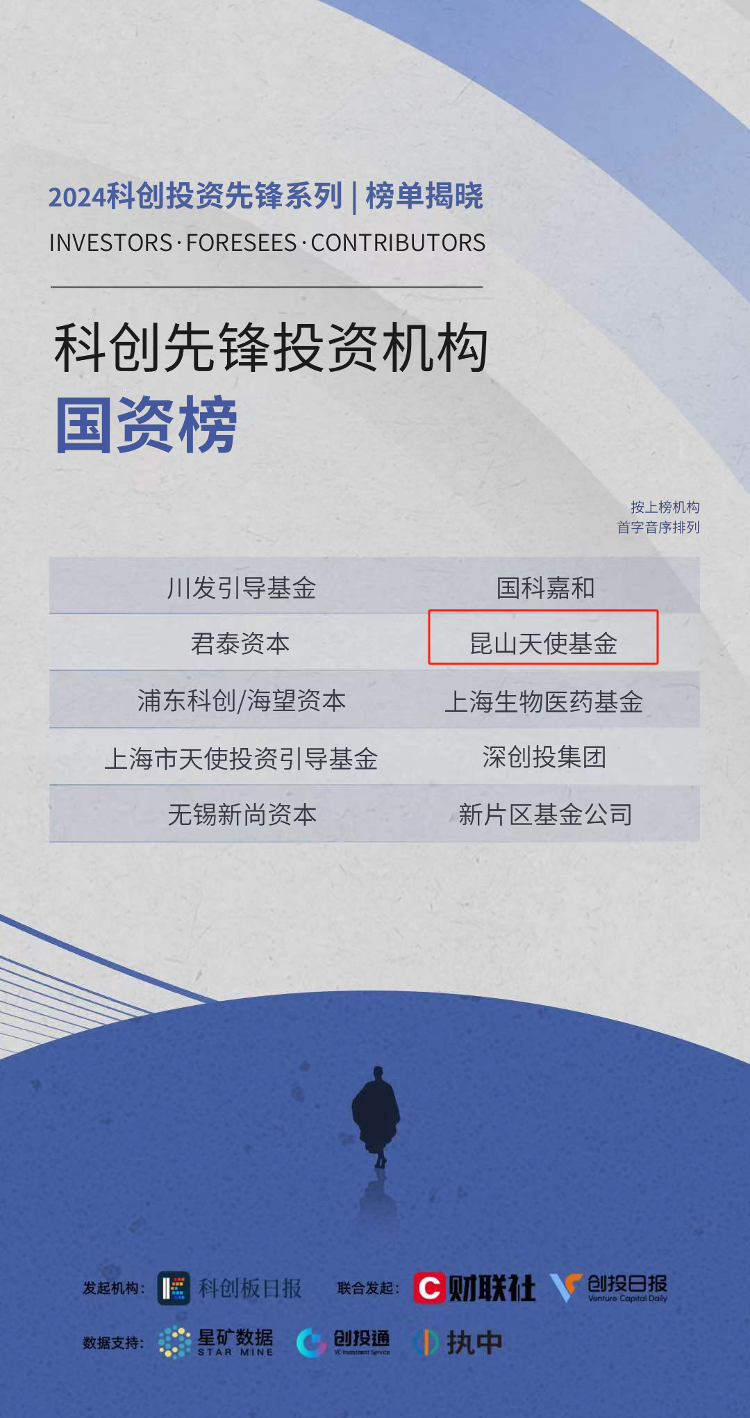 2024年8月21日,2024科創(chuàng)投資先鋒系列榜單盛大發(fā)布。由昆山市工研院牽頭組建的昆山天使基金與上海市天使投資引導(dǎo)基金、川發(fā)引導(dǎo)基金、無(wú)錫新尚資本等一同入選“2024科創(chuàng)先鋒投資機(jī)構(gòu)?國(guó)資榜”TOP10。昆山天使基金也是榜單中唯一一家縣域級(jí)地方國(guó)資基金。