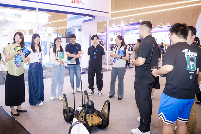 智能機(jī)器人展區(qū),來自我市江蘇路航的技術(shù)經(jīng)紀(jì)人向七騰機(jī)器人有限公司的技術(shù)負(fù)責(zé)人了解其特種機(jī)器人產(chǎn)品的應(yīng)用場景和詳細(xì)參數(shù),未來有意將該項技術(shù)在軌道交通方向進(jìn)行普及。
